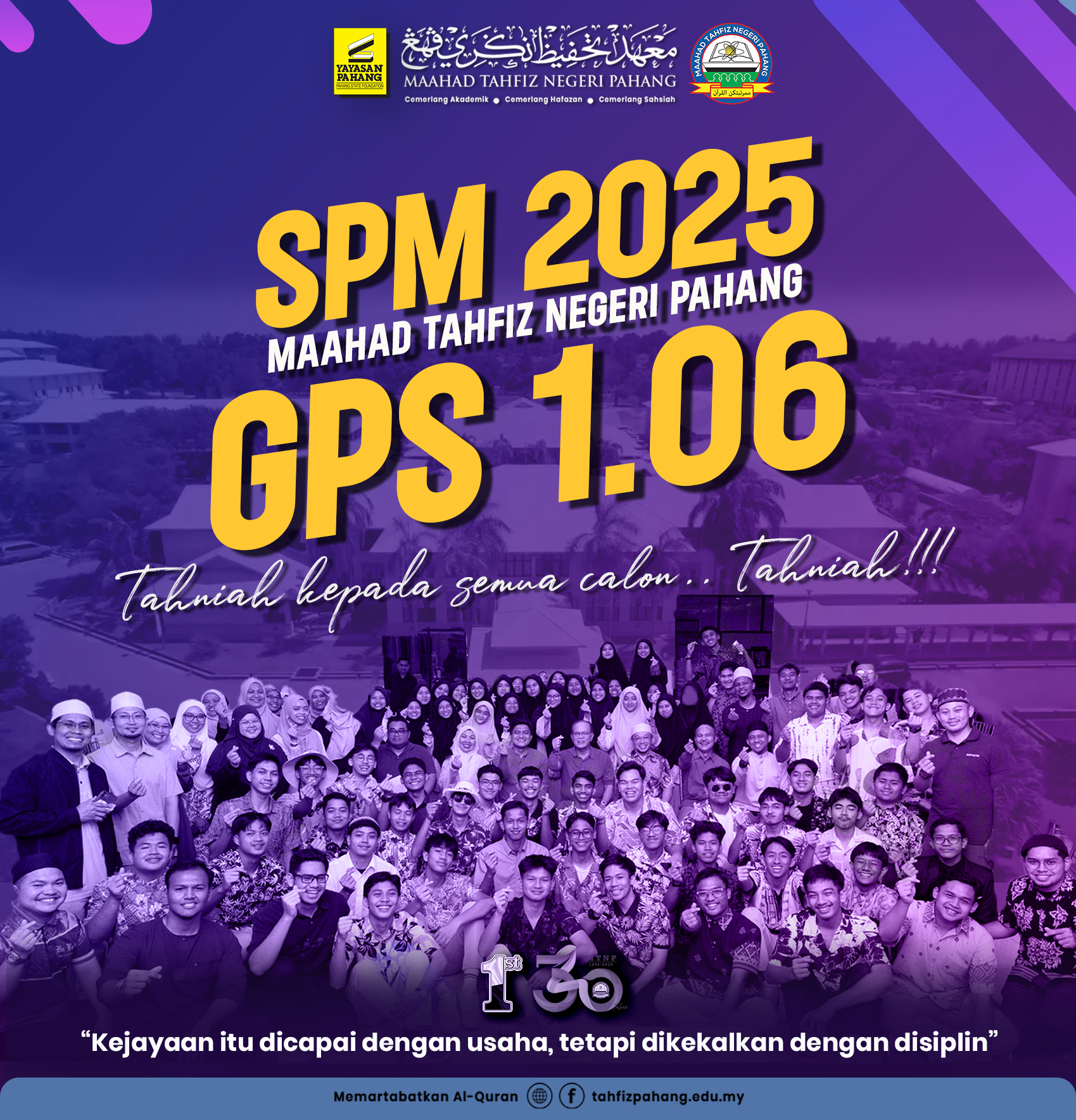 Alhamdulillah, telah berlangsung Majlis Pengumuman Keputusan Sijil Pelajaran Malaysia 2025 Maahad Tahfiz Negeri Pahang bertempat di Dewan Mahkota MTNP. Setinggi-tinggi