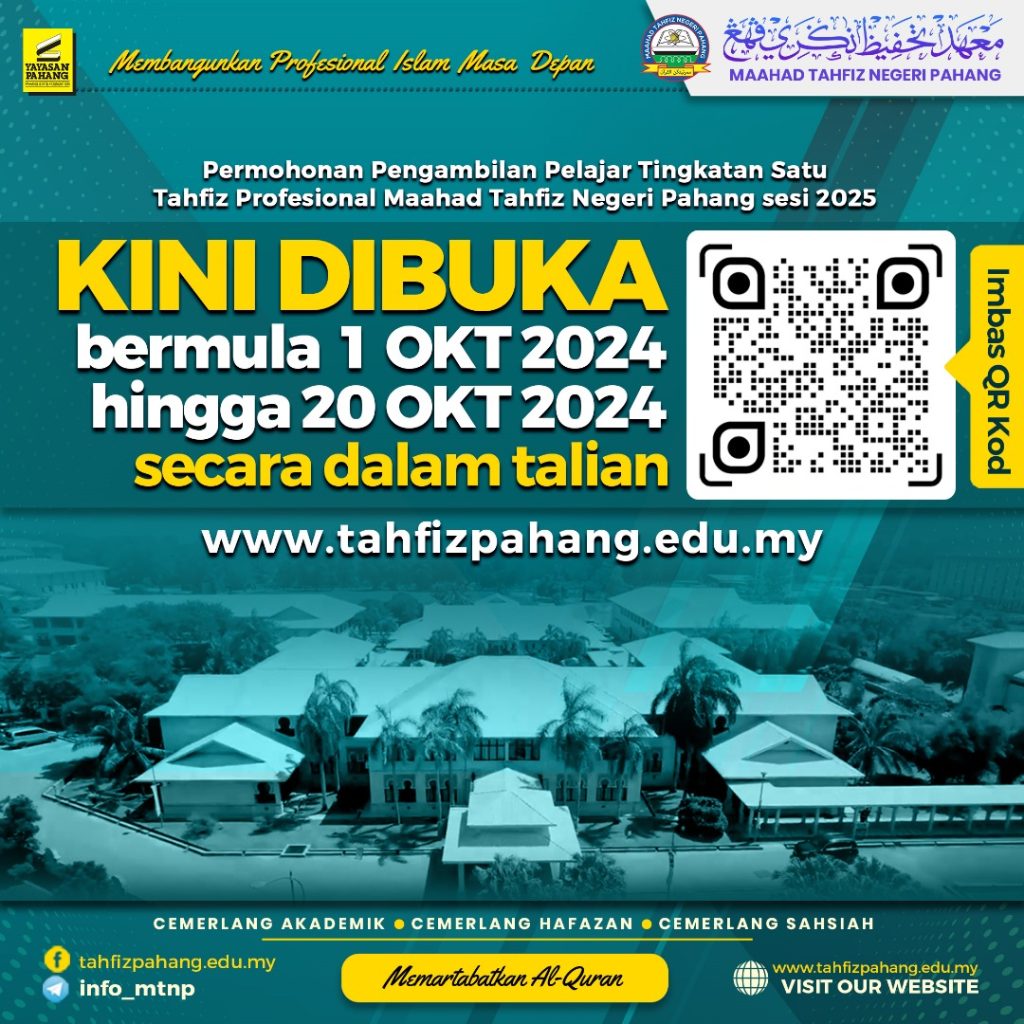 Kini dibuka Permohonan Pengambilan Pelajar Tingkatan Satu Tahfiz Profesional Maahad Tahfiz Negeri Pahang sesi 2025, berikut keterangan ringkas cara-cara permohonan.